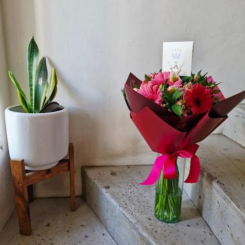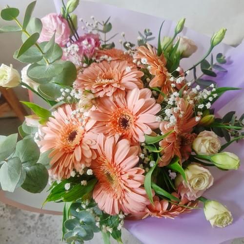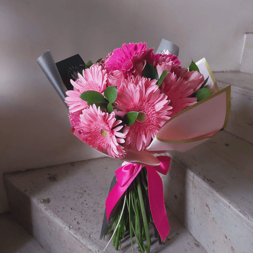 Bouquet de Gerberas, atado con liston de seda y papel coreano.